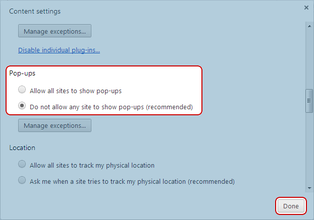 Do not allow any sites to show pop-ups (recommended)". Click the "