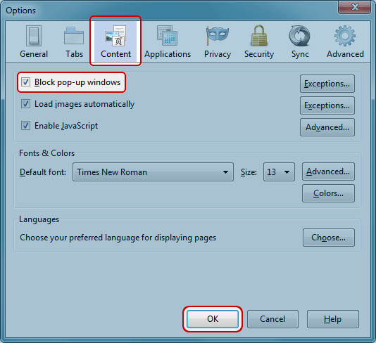 Click on "Content" along the top. Place a check mark next to "Block pop-up windows". Click the "OK" button.