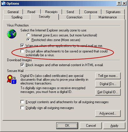 Outlook Express has the ability to block attachments. This feature is usually activated with