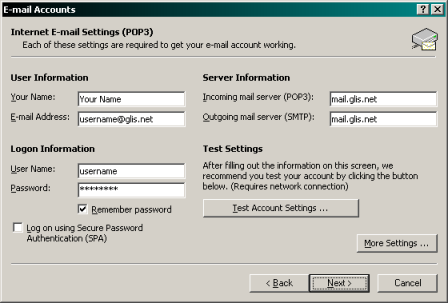 Type in mail.glis.net or mail.c3net.net.
